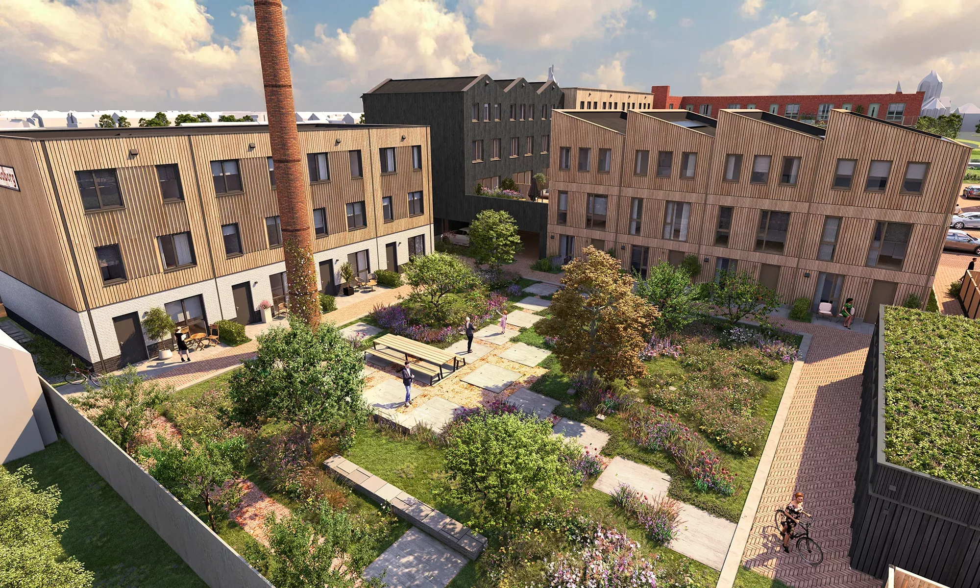 Aan de rand van de groene binnentuin vind je deze vier markante woningen met een industriële look. De sheddaken versterken dit authentieke gevoel van wonen in een fabriekspand. Binnen is jouw woning van ruim 140 m² volledig afgestemd op jouw wensen. De gezamenlijke binnentuin geeft ruimte om elkaar te ontmoeten tussen de fruitbomen en hier kunnen kinderen spelen in het groen. De woningen beschikken over een privé dakterras om te genieten van lange zomeravonden.